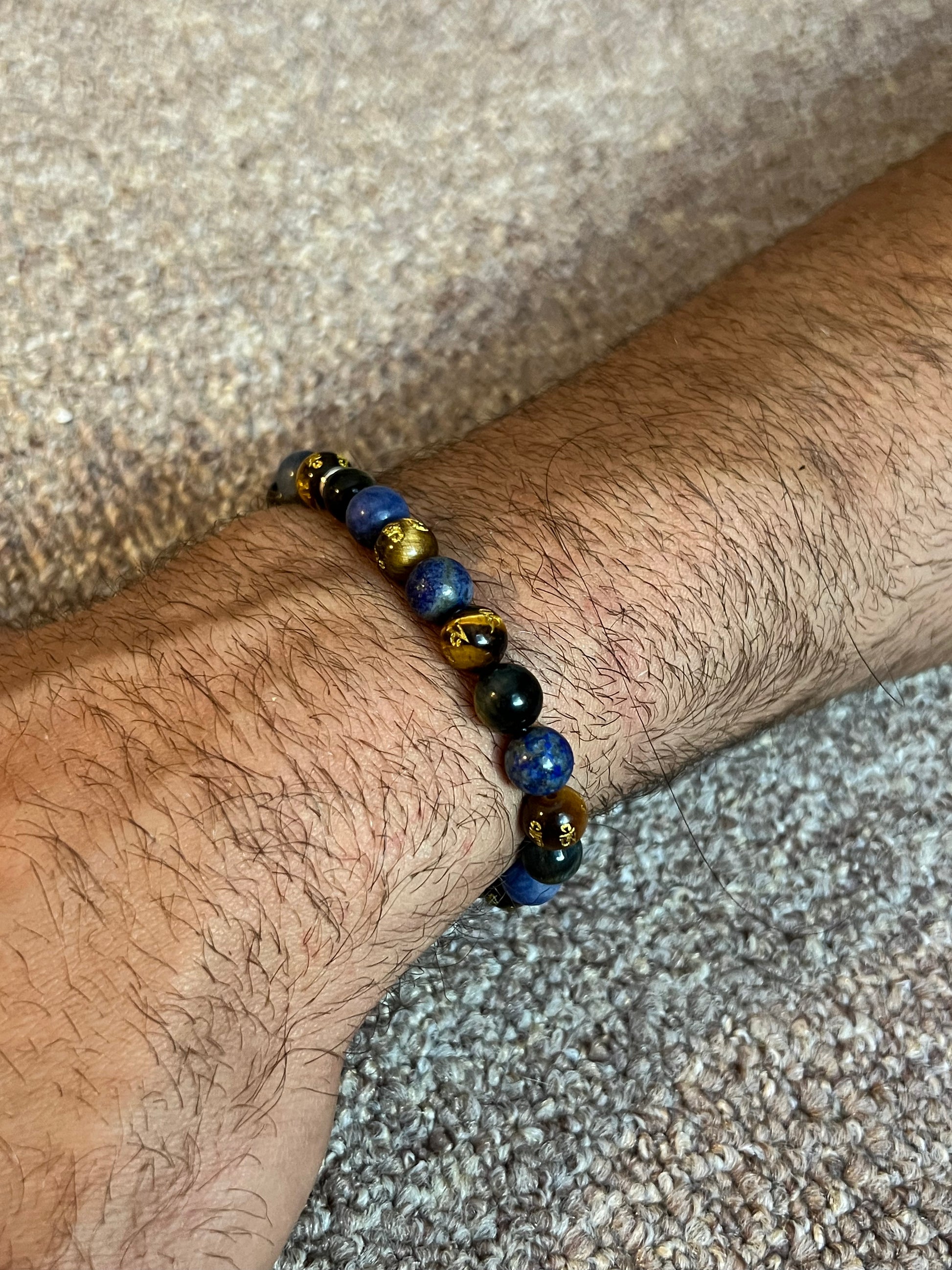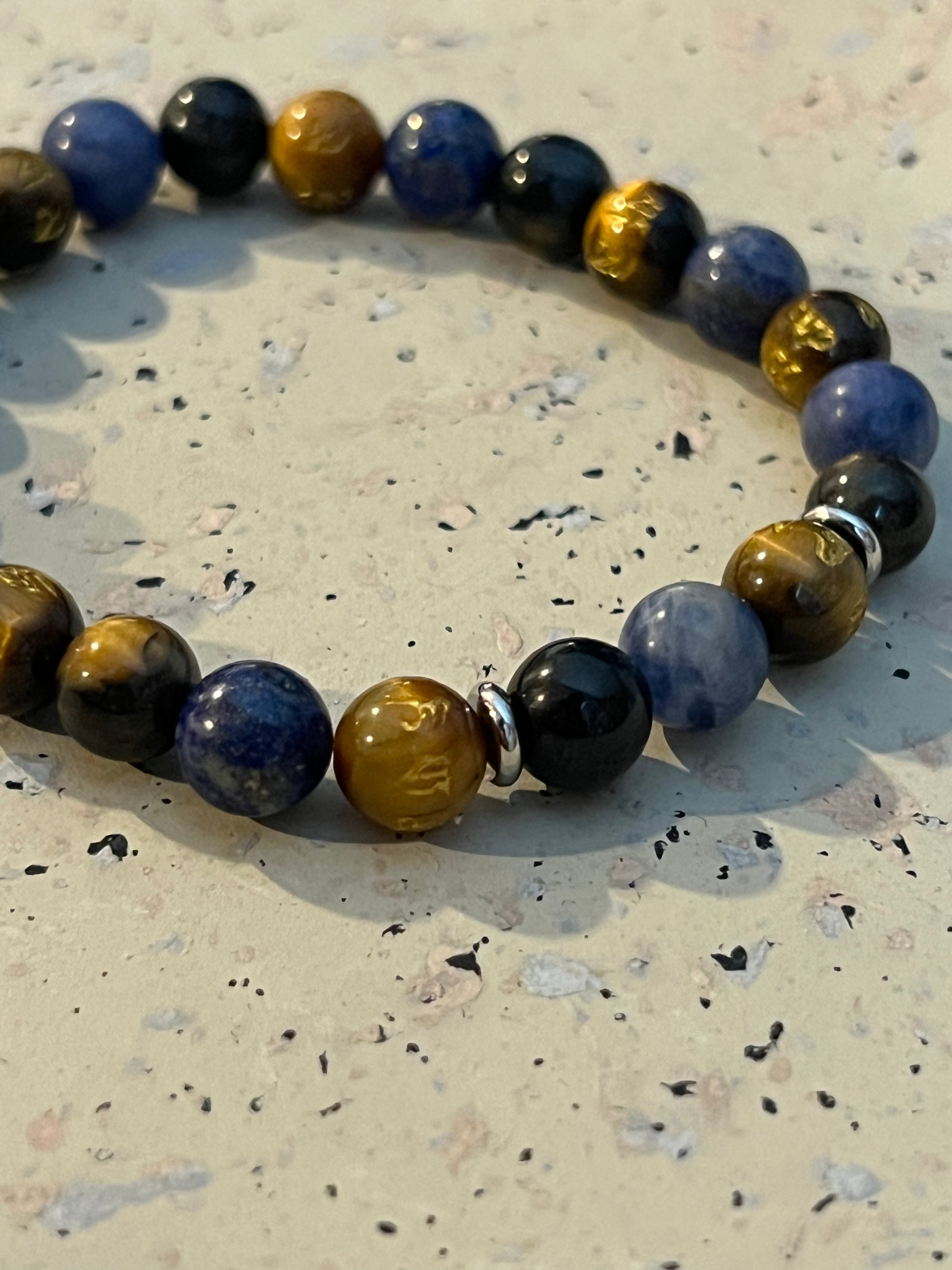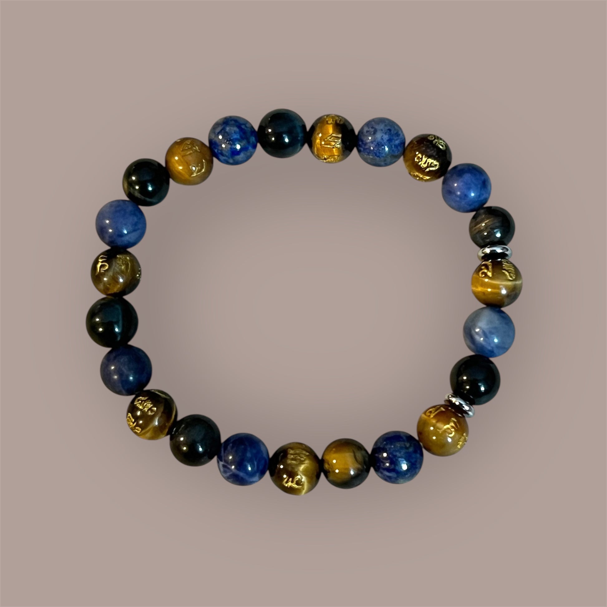 Composé de sodalite, œil de tigre gravé et œil de faucon, il équilibre les émotions, renforce la clarté d’esprit et protège des énergies négatives.